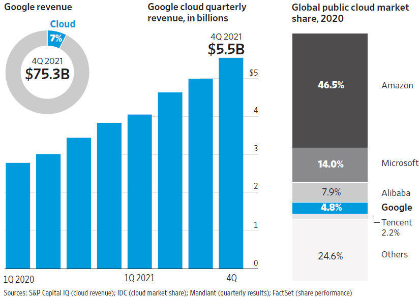 Google Cloud 的销售规模正在快速发展,2021Q4 单季收入为 55 亿美元。即便如此,云计算在 Google庞大收入版图中仅占 7%。