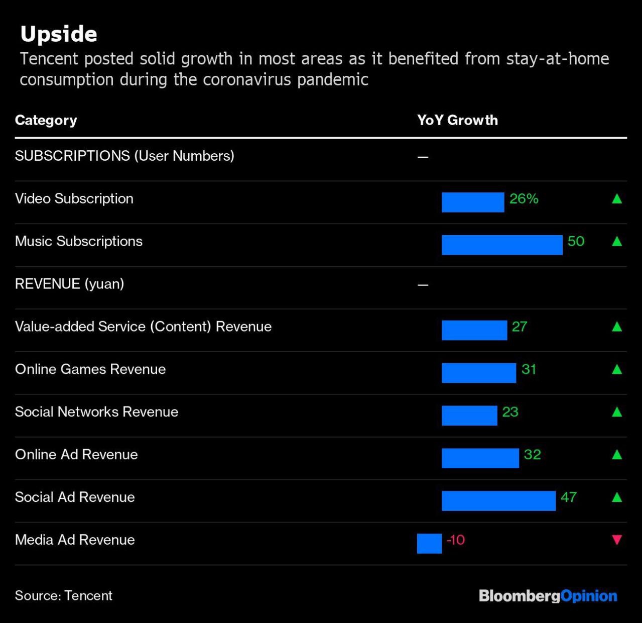 由于消费者将更多时间花在了腾讯旗下的一系列应用程序上,游戏业务收入创下了几年来最大增幅,视频业务的用户数增加,甚至广告收入也出现了增长。