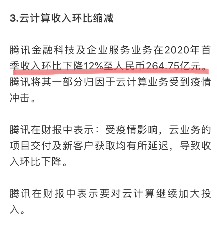 当季业绩的一个不足之处在于其金融科技部门。讽刺的是,这个正帮助消费者和商家从现金支付转向数字支付的业务,恰恰在实体商业活动陷入停顿(线下交易和现金提取减少了)的时候受到了冲击。腾讯的云业务也受到影响,因为在停工隔离期间新项目的部署被推迟。