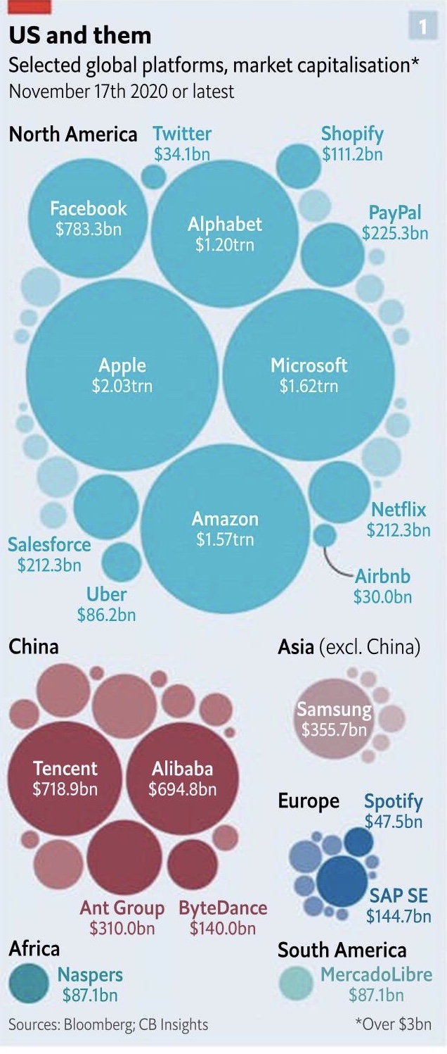 然后真正能成为产业界认可的 “平台” 数量并不多。附图是经济学人杂志绘制的一张目前全球大型平台的一览,圆圈大小代表 2020年11月的市值。这张图也间接折射了科技公司各地区的能力大小。