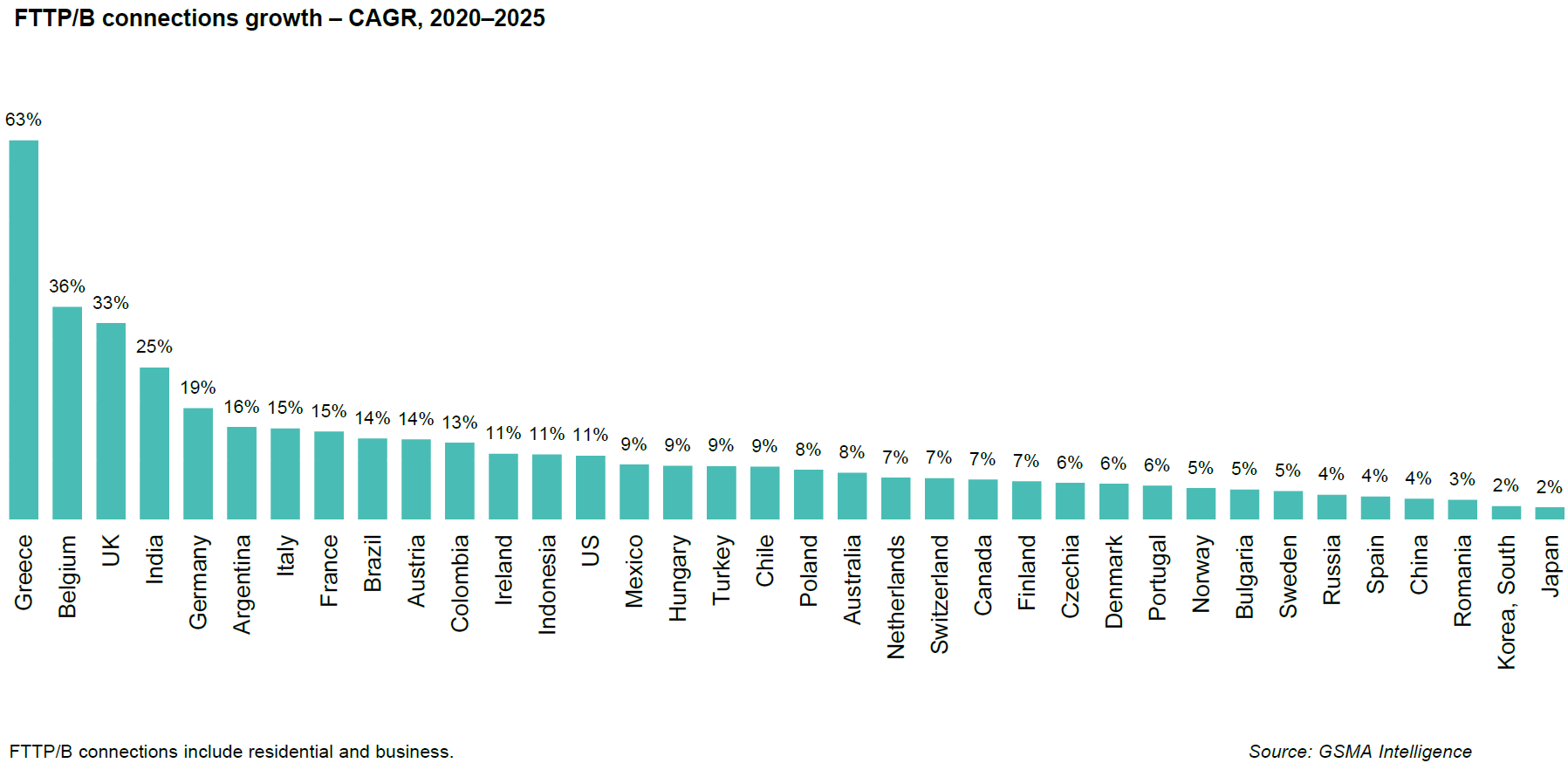 GSMA 对主要国家和地区的固定宽带在 2030 年的状态做了一版预测。