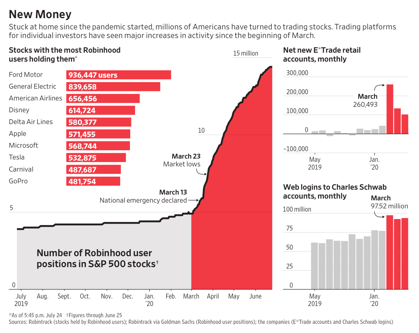 新冠疫情期间,美国人民也汹涌澎湃的进入股市,直接成为“交易员”。仅三月份就新开户 26 万个,远超平常年份一年的户头。