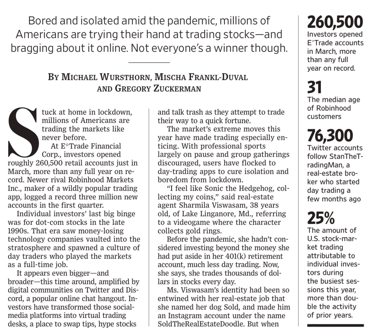 华尔街日报提及,上次散户这么火爆还是在上世纪九十年代的第一轮互联网泡沫时期。