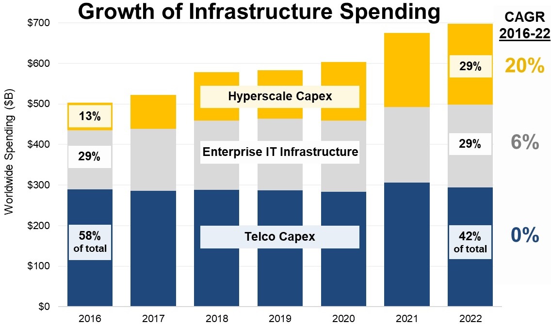2016 年,整体 CAPEX 中有 58% 来自运营商,29% 来自企业,13% 来自大型互联网公司。