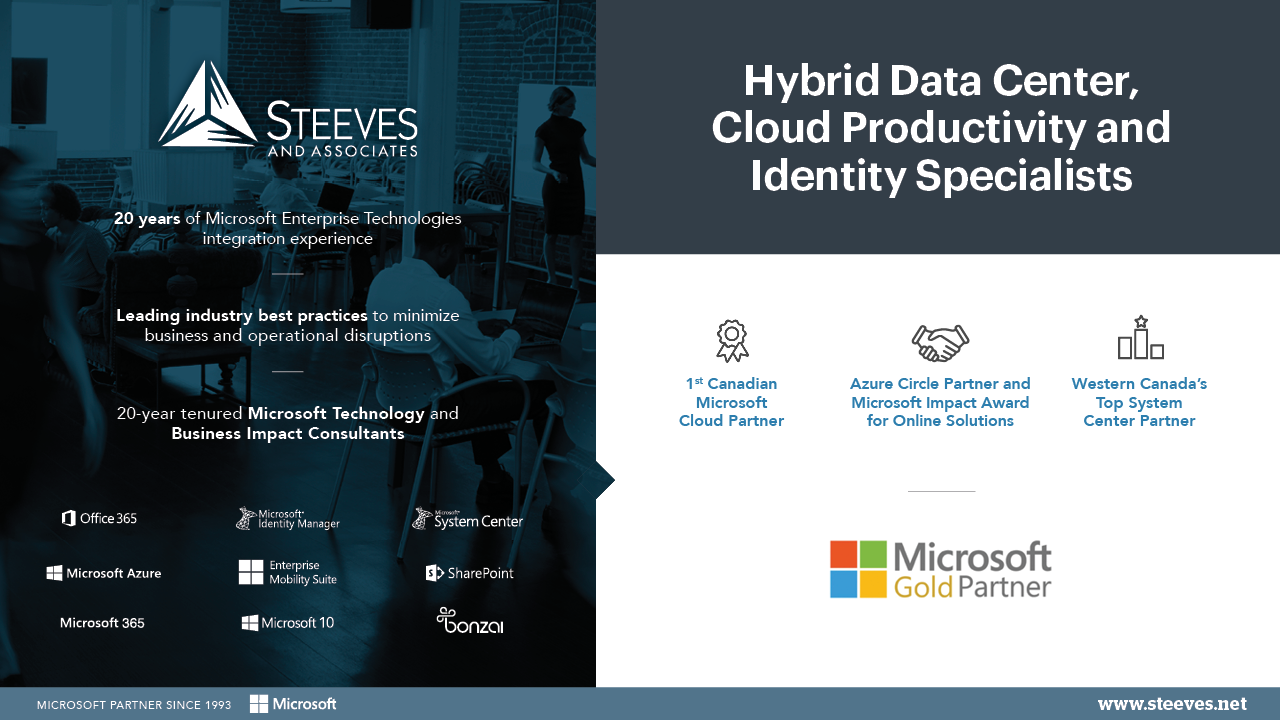 Steeves and Associates delivers unparalleled Cloud Consulting expertise as the 1st Microsoft Cloud Partner in Canada. Steeves and Associates works with you to understand and assesses your current problems and limitations to determine an appropriate cloud roadmap identifying ‘quick wins’ and opportunities for innovation.