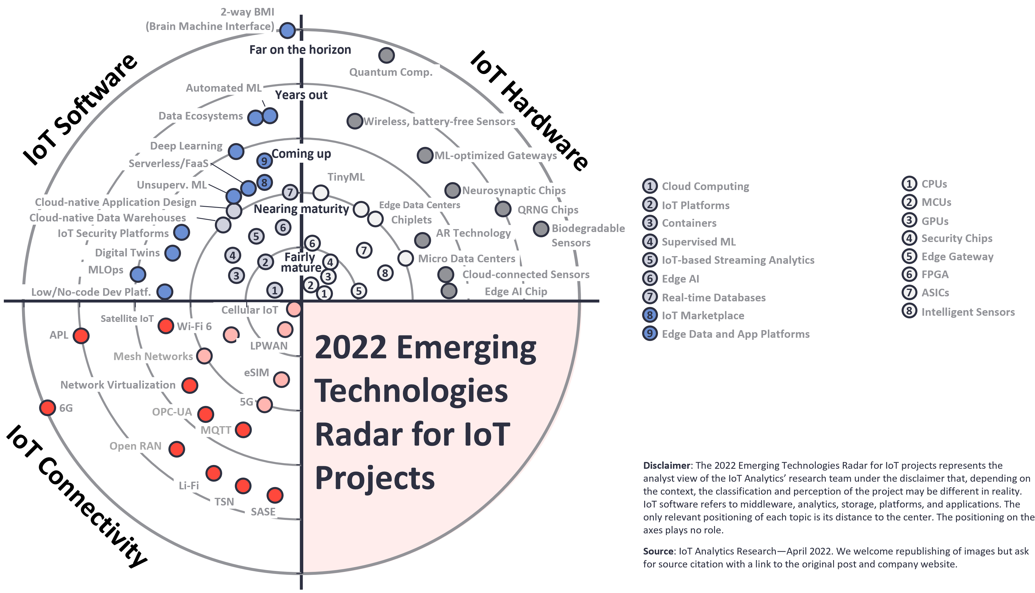 IoT Analytics 咨询公司绘制了一个 “新兴 IoT 技术雷达”,用来对目前比较火的物联网相关技术进行成熟度评分。