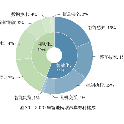 智能网联汽车是汽车行业与 ICT 行业深度结合的产物。附图是 2020 年相关细分类别的专利构成。