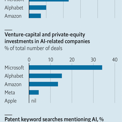 The Economist 统计了 Apple、Meta(Facebook)、Microsoft、Alphabet(Google)和 Amazon 北美五大科技公司在 AI 上的投入。
