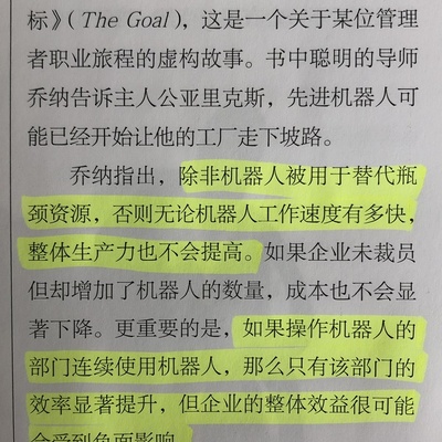 哈佛商业评论的一篇文章,提及一个观点:机器人必须要从事企业的瓶颈任务,否则非但不会提高生产力,反倒会增加成本,对企业效益产生负面影响。
