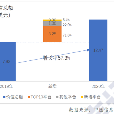 根据信通院的监测,截至2020 年12 月31 日,全球市场价值超100 亿美元的数字平台企业为76 家,价值总额达12.5 万亿美元,同比增速高达57%。