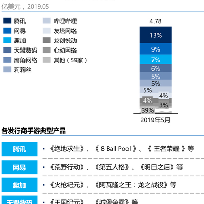 前 100 游戏产品发行商中,腾讯(13%)、网易(9%)和趣加(7%)分列前三位。