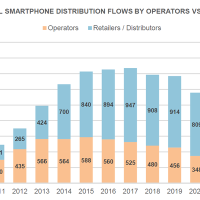 手机是移动网络中最重要的终端类别。那么全球整体来看,有多少手机是通过运营商渠道分销,多少是第三方零售渠道分销呢?