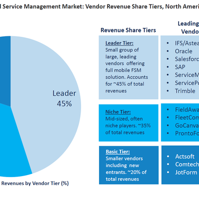 Frost & Sullivan 咨询公司对 FSM 进行了研究,并按软件服务供应商进行了分层;大致 45% 的收入来自诸如 SAP、Oracle 等领先服务商;也有 35% 比例来自细分市场。
