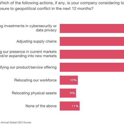 PwC 2023 全球 CEO 调研中,关于 “您的公司正在考虑采取以下哪项行动(如果有的话)来缓解未来12个月内地缘政治冲突的风险?”。