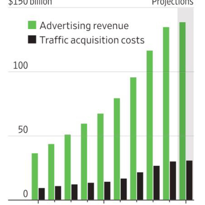 下图展示了 Google 历年的流量获取成本与广告收入的对比。可以看到一条很健康的曲线,即:收入与流量成本的差距越来越拉大。