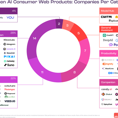 a16z 基于 SimilarWeb 的网站流量访问数据(截止到 2024 年 1 月),发布了新的榜单针对 AI Web 版的消费类产品 Top 50。