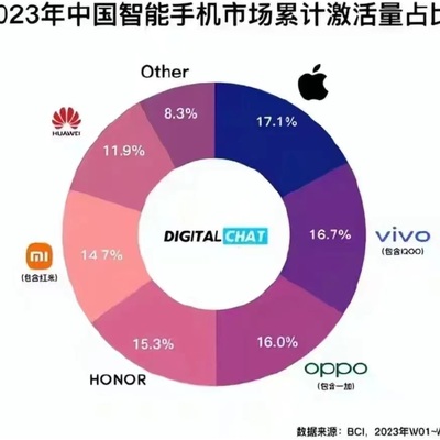 BCI 数据监测显示,2023 年(前 50 周)中国新激活的智能手机中,Apple 以 17.1% 占据首位。Vivo、Oppo、荣耀、小米和华为分列第二到第六名。
