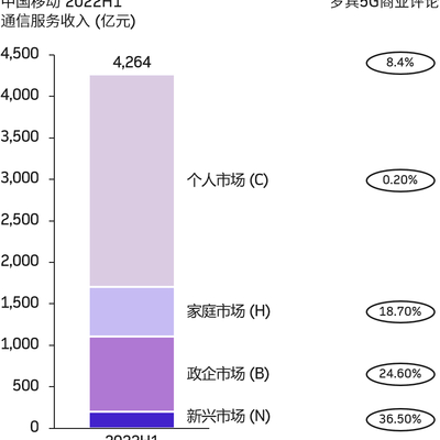 中国移动 2022 年上半年通信服务收入 4,264 亿元,同比增长了 8.4%;整体营运收入 4,969 亿元,同比增长了 12%。