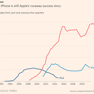 附图展示了 iPod、iPhone 和 iPad 的出货量变化,其实还应该增加一个 AirPods 的数据。