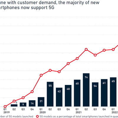 2022 年前两个季度的发布款型分别为 65 款和 82 款。在整体智能手机中,支持 5G 的款型提升到了 73%。