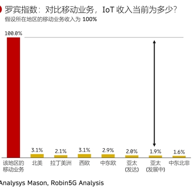 假设移动业务收入为 100%,物联网 IoT(连接相关)目前在全球各地区均处于很低水平,基本都在 1.5~3% 左右。