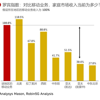 假设移动业务收入为 100%,家庭业务目前在全球各地区呈现较大差异,北美(110%)和西欧(88%)处于很发达的水平,亚太地区绝对值尚可,但还有较大的潜力空间。