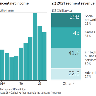 附图是 WSJ 绘制的腾讯 2021 年二季度报告主要数字。