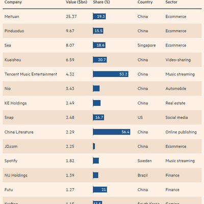 Financial Times 汇总了一张表,罗列了腾讯持有股份市值超过 10 亿美金的上市公司。