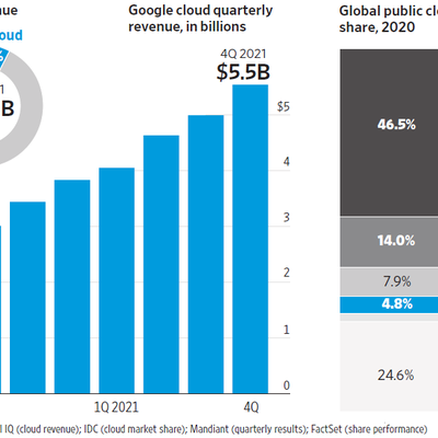 Google Cloud 的销售规模正在快速发展,2021Q4 单季收入为 55 亿美元。即便如此,云计算在 Google庞大收入版图中仅占 7%。