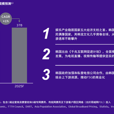 读到安永的一项研究,围绕韩国的超高清视频市场的预测,2020 年约合 357 亿人民币,2025 年为 378 亿人民币,五年的复合增长率为 ~1%。