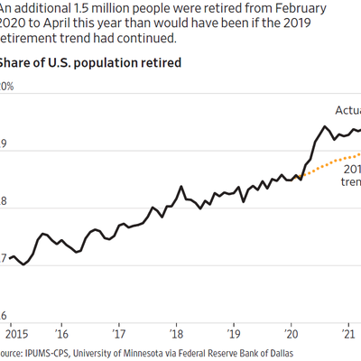 根据 WSJ 的报道,美国 2020 年 2 月到 2021 年 4 月新增了 150 万退休人口。