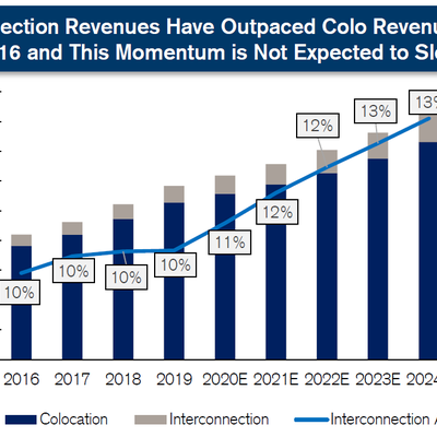 根据 Credit Suisse 的研究,Interconnection 的收入增长是超过主机托管收入的。全球统计看,Interconnection 在 2015~18 CAGR 为 14.5%,在 2019~2024 也会保持 CAGR 12.2%,算一个高速赛道了。
