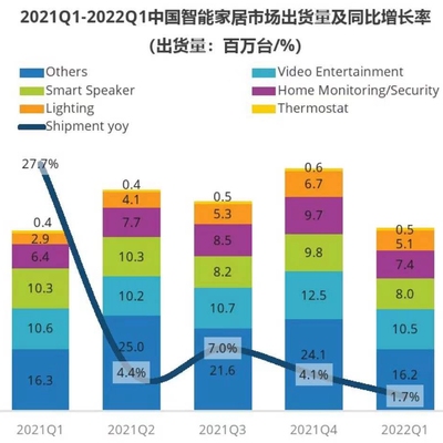根据 IDC 的研究,中国智能家居设备市场 在 2022Q1 出货量为 4,778 万台,同比增幅为 1.7%,对比一年前增长趋势大幅放缓。