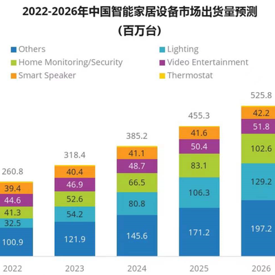 IDC 咨询公司预计到 2026 年,中国智能家居设备出货量将达到 525.8 万台,对比 2022 的体量大约接近翻倍。