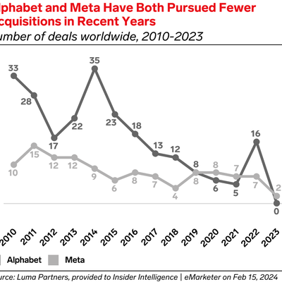 Luma Partners 的研究显示,Google/Alphabet 和 Meta 的并购案例数呈现减弱态势。对照2010 前后,Alphabet 减少到了三分之一,Meta 减少到了三分之二。
