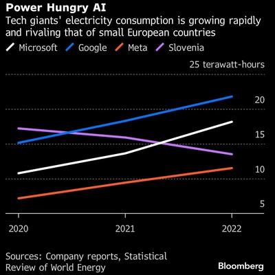 Bloomberg 研究显示,Microsoft、Google、和 Meta 等大型云服务商的电力消耗已经或者正在超过欧洲的斯洛文尼亚(Slovenia)。