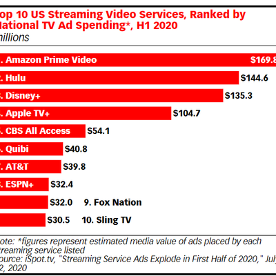 根据 iSpot.tv 的研究,2020年上半年美国主要流媒体公司的总广告价值达到 10 亿美元,对比 2019 年的 3.28 亿美元有大幅提升。